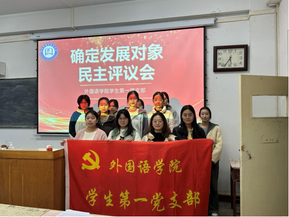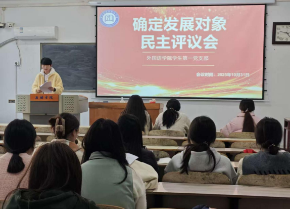 为深入学习贯彻党的创新理论,严格党员发展流程,壮大党支部骨干力量,外国语学院学生第一党支部于2025年10月31日在 A11-404召开确定发展对象民主评议大会。会议由外国语学院学生第一党支部书记芦琳主持,支部全体成员参会。