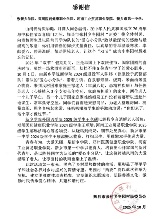 近日,外国语学院收到一封来自辉县市张村乡枣园村民委员会的感谢信。信中,村委会携全体村民,对以外国语学院2025级外国语言文学类3班王竞砚为代表的“爱心小分队”在“双节”期间的暖心善举致以崇高敬意,字里行间满是对学子们用青春担当传递温暖的认可与感激,也让学院“立德树人”的育人成果再次得到生动印证。