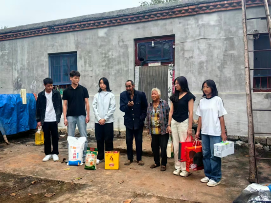 这份温暖的认可,源于2025年10月1日-8日中华人民共和国成立76周年与中秋佳节“双节”同庆之际的一场爱心行动。当时,由新乡学院商学院2024级退役军人陈炜(曾服役于武警部队)带队的“爱心小分队”,冒雨走进辉县市张村乡枣园村,为当地困难老人送去节日关怀。作为小分队中的一员,王竞砚同学主动发挥自身语言优势,全程用亲切的辉县乡音与老人唠家常,耐心倾听任俊英、王禄两位老人的心声。据悉,任俊英老人心脏植入3个支架,需长年服药,家庭负担沉重;王禄老人年届八旬且患有精神疾病,两位老人均因子女或早亡、或远赴外地谋生,常年孤守空屋。活动中,王竞砚同学不仅为老人排解孤独,还与小分队其他成员一道,为老人送去月饼、百泉春寿酒、烧鸡、米面油等爱心物资,并为他们整理房间、测量血压。从精心筹备物资到动手打扫卫生,学子们用细致的行动传递温情,任俊英老人紧握王竞砚的手激动地说:“你们来了,这个家才像过节。”